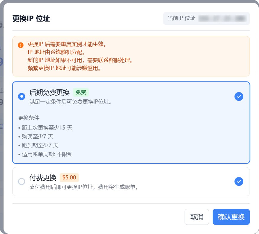 之前更换IP都要发工单,现在直接可以自助更换了。
